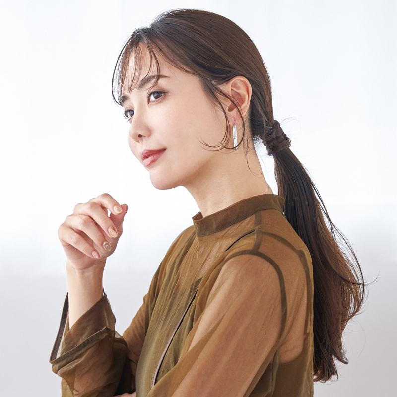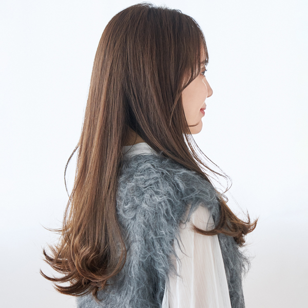 今っぽさを決めるのは今は顔周りのカット。長さを変えなくてもガラッと雰囲気を変えることができます。前髪は幅を狭く取ってシースルーに。サイドバングはフェイスラインを丸く包み込むようにカットし、もみあげの一束と繋がるように。さらにデコルテラインにもハイレイヤーを入れることで華やかで広がらないロングヘアに。