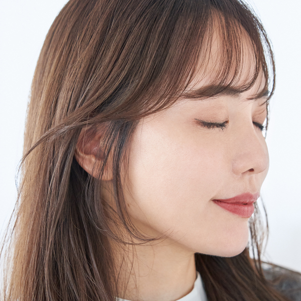 顔周りのレイヤーは耳前にのみ入れるのがコツ。あごラインから流れるようにCシェイプレイヤーを入れ、毛先は重ためにカット。