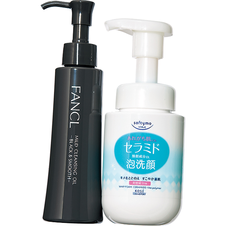 左:美白コスメを効 かせるため、毛穴汚 れと角栓をしっかり取り去ることを優先。マイルドクレンジングオイル<ブラック&スムース>¥1,980(ファンケル)右:セラミド入りなので乾き知らず。秋の乾燥肌にも安心。ソ フティモ 泡洗顔 ¥602(コーセーコスメポート)