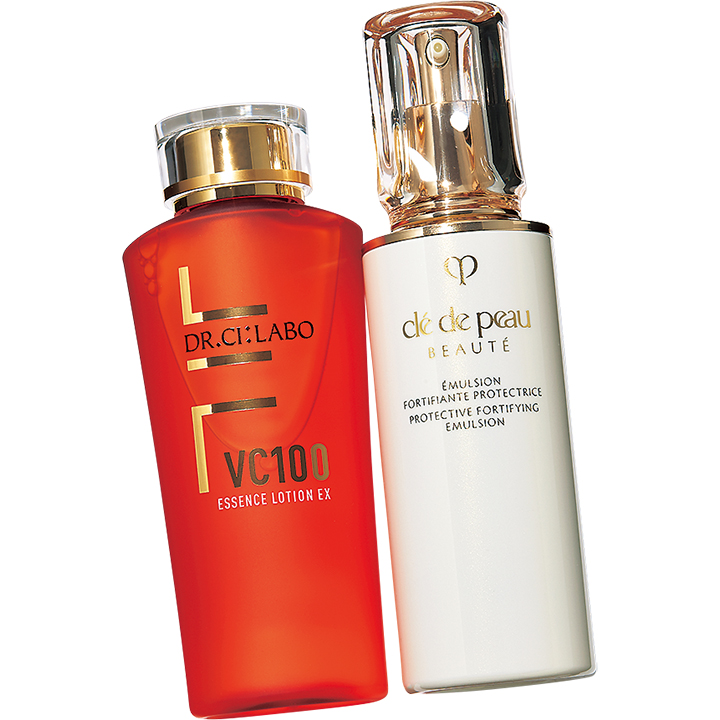 左:使用感もしっとりで秋にぴったり。VC100 エッセンス ローション EX ¥5, 170(ドクターシーラボ)右:トラネキ サム酸配合で美白効果もあり、UVカッ トもしてくれる優れモノ。使用感が極上。エマルションプロテクトゥリス n ¥13, 200(クレ・ド・ポ ー ボーテ)