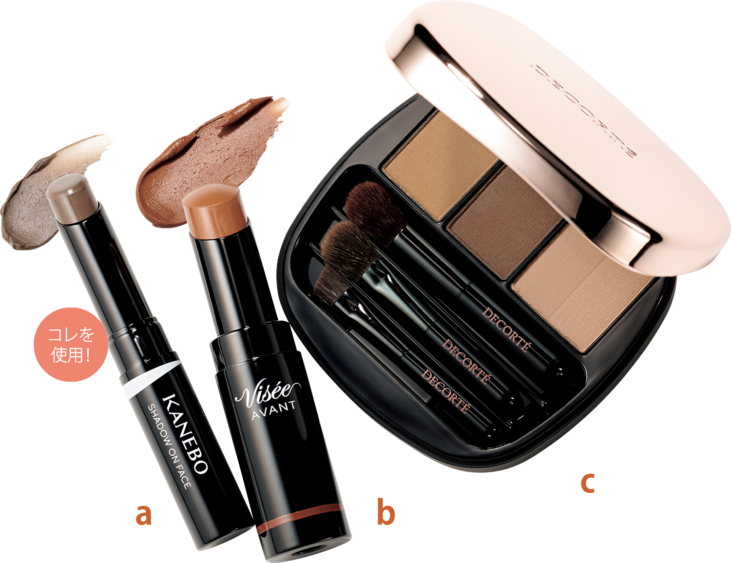 a:ノーズシャドウとアイブロウがセットになった使いやすいパレット。まろやかな発色が絶妙です。コスメデコルテ コントゥアリング パウダーアイブロウ BR302 ¥4,950(コスメデコルテ)b:シェーディングはもちろん、アイカラーやリップとしても使える万能スティック。ヴィセ アヴァ ン マルチスティックカラー 010 ¥1,980<編集部調べ>(コーセー)c:リアルさを追求した影色がさりげなくも確実に顔の立体感を際立たせます。KANEBO シャドウオンフェース 01 ¥3,300(カネボウインターナショナルDiv.)