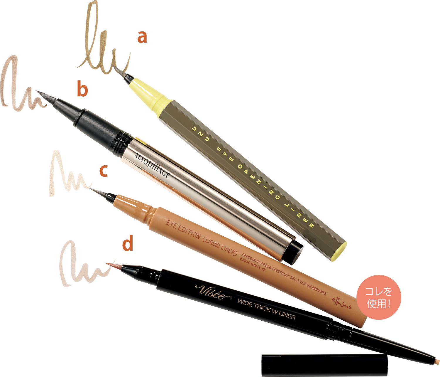 a:描きやすさや持ちのよさが抜群なのにお湯で簡単に落とせるのが魅力。UZU BY FLOWFUSHI アイオープニングライナー カーキ ¥1,694(UZU BY FLOW FUSHI)b:透け感のある秀逸なカラーでこっそりと目力を強化。ウォータープルーフなのも嬉しいポイント。シークレットシェーディングライナー ¥2,750<編集部調べ>(マキアージュ)c:グロウパール配合で濡れたようなツヤ感のあるカラーが肌に密着。エテュセ アイエディション(リキッドライナー)03 ¥1,430<編集部調べ>(エテュセ)d:コンシーラーとリキッドライナーがセットされたダブルエンドタイプ。透け感のある影色ブラウンはマルチに使えます。ヴィセ ワイド トリック ダブルライナー 01 ¥1,650<編集部調べ>(コーセー)
