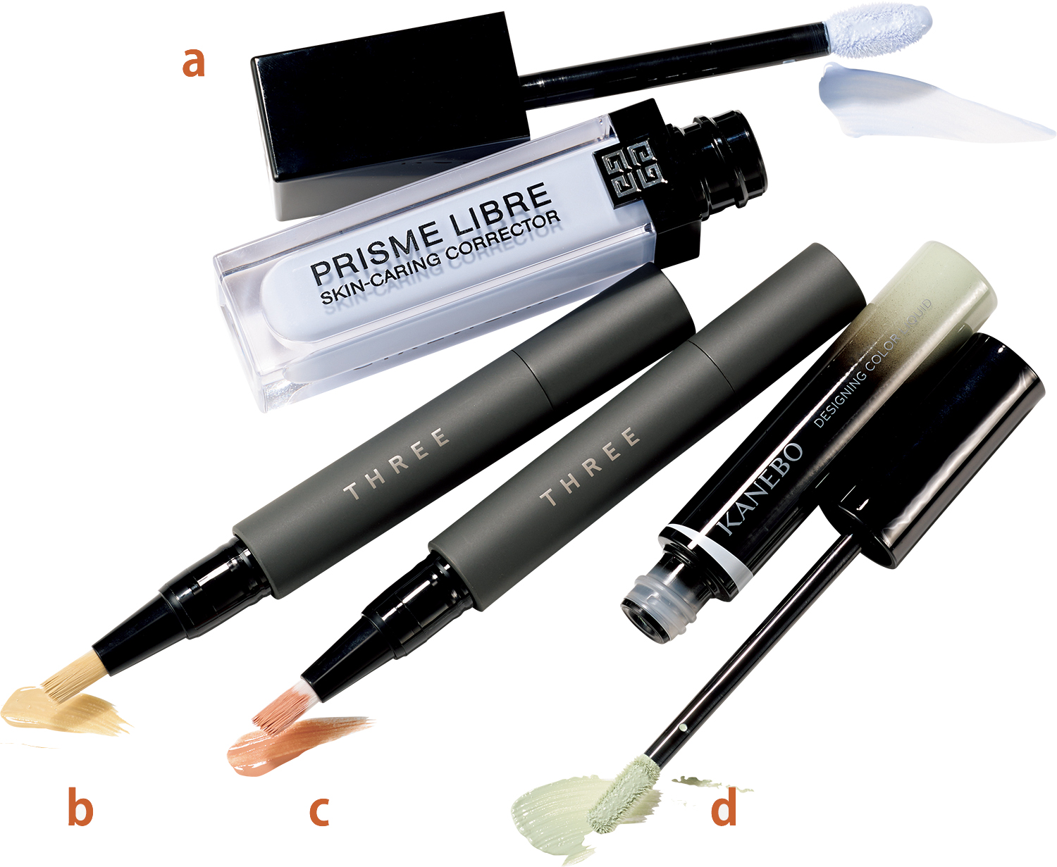 a:くすみなき透け感肌に。目の下の黄ぐすみ が気になるならブルーを選んで。プリズム・リーブル・スキンケアリング・コレクター ブルー ¥4,620(パルファム ジバンシイ[LVMH フレグランスブランズ])b:お直し用にも使いやすいナチュラル仕立てのコンシーラー。目の下の茶クマや赤みにはイエローを。THREE アドバンスド スムージング コンシーラー YE ¥3,850(THREE)c:オレンジは血色不足の青クマに。THREE アドバンスド スムージング コンシーラー OR ¥3,850(THREE)d:肌の色のトーンを均一に整えてくれます。赤ぐすみにもおすすめ。KANEBO デザイニングカラーリクイド 04 SPF4・PA+ ¥3,300(カネボウインターナショナルDiv.)