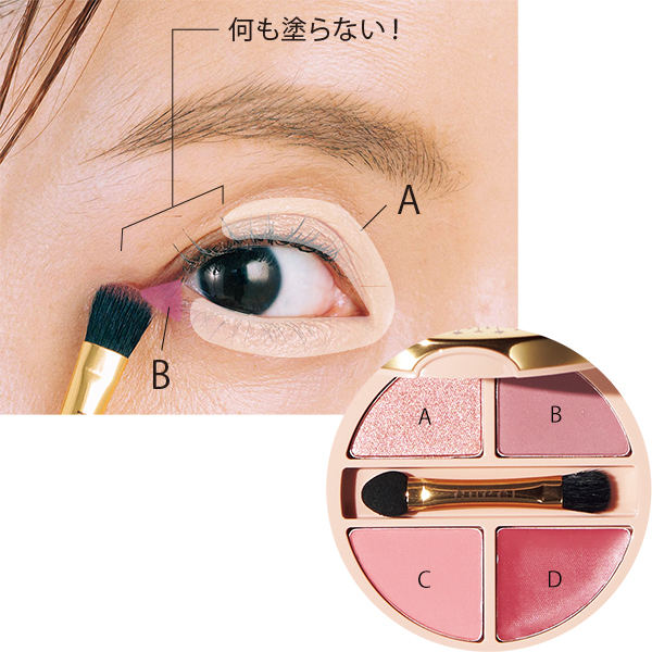 グッチのパレットでメーク!ブラシでAの薄ピンクを上瞼の目頭から黒目上まで、下瞼にも。普段濃くしがちな目尻上側にはあえてのせず抜け感を。Bのピンクは下瞼の目尻にプラスし女っぽく。