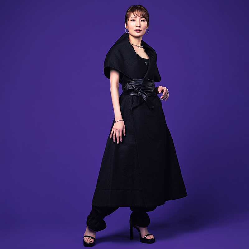コート¥97,900、パンツ¥60,500(ともにディウカ/ドレスアンレーヴ)ネックリング¥138,600、バングル¥74,800、ピアス¥47,850、イヤカフ¥154,000、中指のリング¥41,800、人差し指のリング¥31,900(すべてジョージ ジェンセン)サンダル、ベルト、インナー(スタイリスト私物)