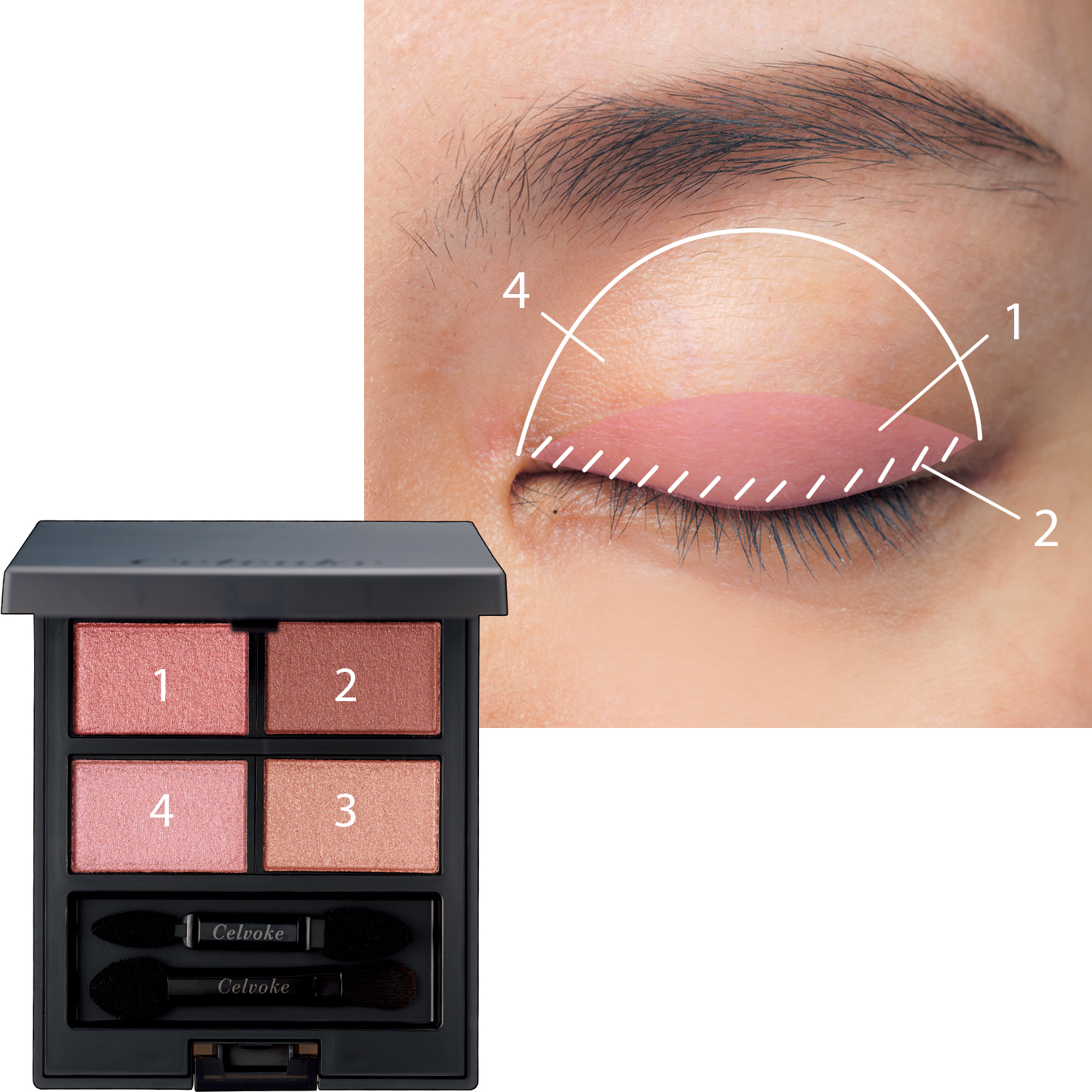 ④をアイホール全体に塗ったあと、①を二重幅にのせて。上まぶたのブラウンのアイライン(c )を馴染ませるように②を上まぶたのキワにオン。涙袋メークを品よく目立たせるために、上まぶたはラメは控えめに。