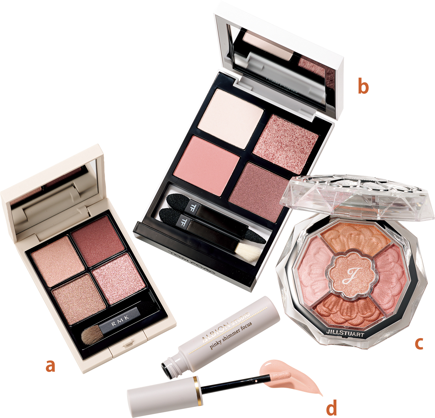繊細なパールと大人ピンクがセットされた涙袋メークに使いやすいアイカラーパレットを3つセレクト。a:異なる質感でアレンジしやすいのが魅力。透明感のある発色なのも◎。RMK シンクロマティック アイシャドウパレット 04 ¥6,380(RMK Division)b:肌への密着感も抜群で、サテンのような艶感やシアーな発色など多彩な質感が楽しめます。アイ カラー クォード 30R ¥12,980(トム フォード ビューティ)c:まろやかなピンクとオレンジが目元をふんわり包み込みます。ジルスチュアート ブルームクチュール アイズ シュエルドブーケ 03 ¥6,380(ジルスチュアート ビューティ)d:ラメやパールが得意じゃない場合は、上品な艶ピンクのハイライトがおすすめ。涙袋の中央に塗って左右に馴染ませるだけで下まぶたの立体感がアップ。手軽に潤んだ眼差しが演出できます。アルビオン スタジオ ピンキーシマーフォーカス ¥3,300(アルビオン)