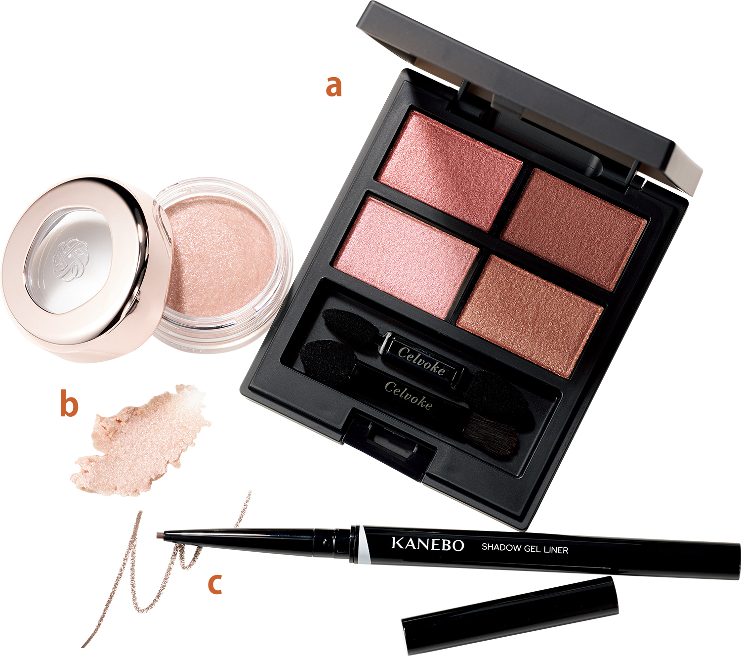 a:甘すぎないビターピンクが、くすみを払って透明感のある愛らしい目元に。セルヴォーク ヴァティック アイパレット 02 ¥6,820(Celvoke)b:透け感のある艶発色のアイカラー。ピンクメークと好相性。コスメデコルテ アイグロウジェム スキンシャドウ 03G ¥2,970(コスメデコルテ)c:まつ毛になりすます有能ジェルライナー。ソフトに仕立てた目元をさりげなく引き締めるグレージュをセレクト。KANEBO シャドウジェルライナー SG2 ¥3,520(カネボウインターナショナルDiv.)