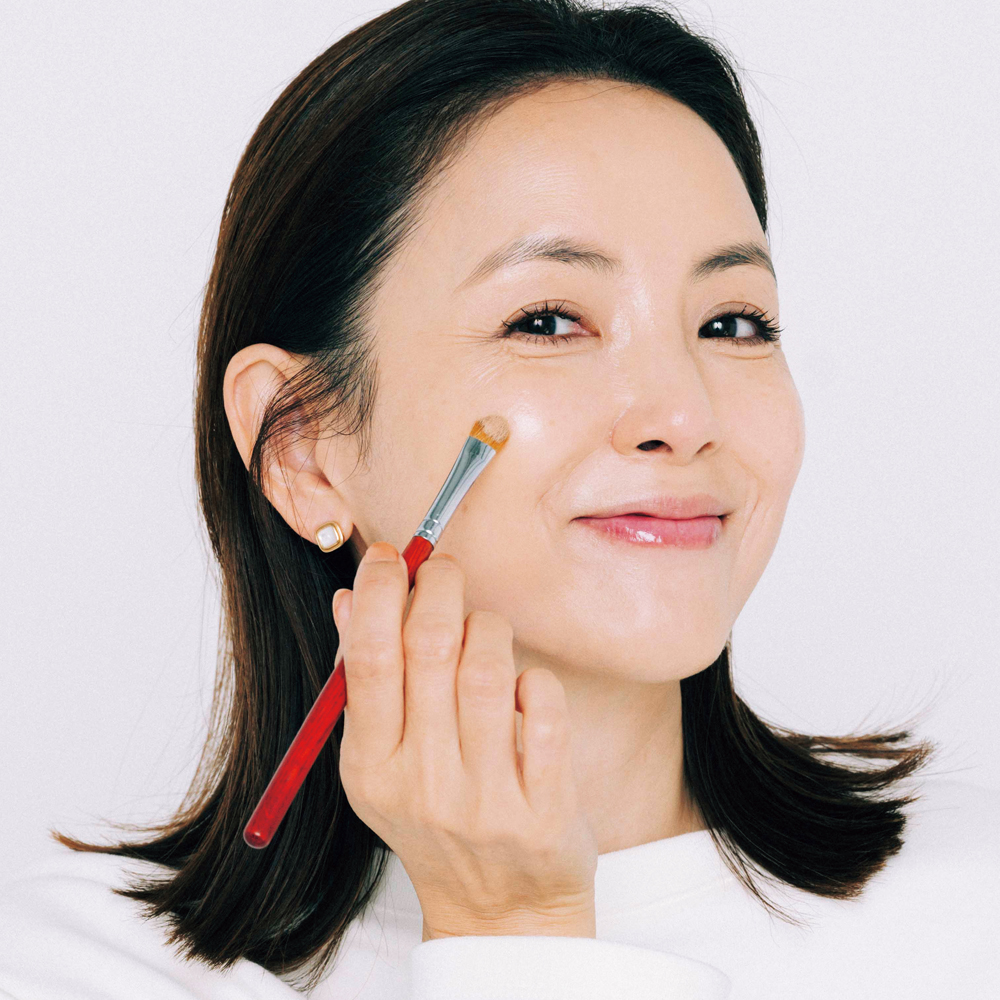 ファンデは両手でザザッとのばす。時短メークでも目立つシンボルシミは消したいのでブラシにコンシーラーを取って高速トントン!