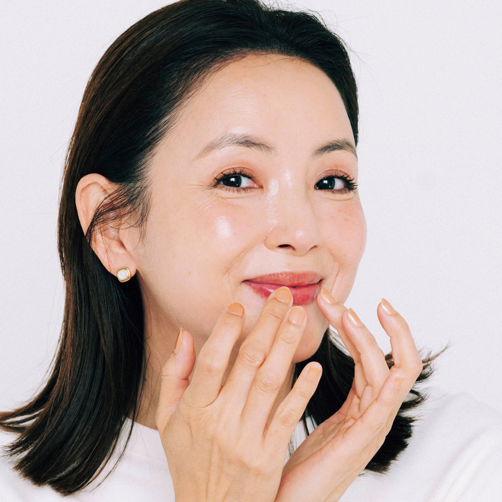 唇、チーク、目元などに自由に使えるマルチコスメが便利。指に取ったらまず唇にぐるっと1周、素早く塗って唇を合わせ馴染ませて。
