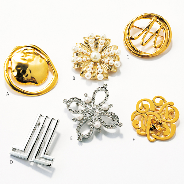 A:どんな衿元にもマッチするシンプルなゴールドのデザイン。¥4,950(ミラ オーウェン/ミラ オーウェン ルミネ新宿2店)B:サイズの違うパールで胸元にリズムを。¥3,520(ラ トータリテ/ラ トータリテ 有楽町マルイ店)C:顔に明るさが生まれるゴールドカラー。¥5,500[10月上旬発売](ミラ オーウェン/ミラ オーウェン ルミネ新宿2店)D:デフォルメされた花モチーフの右下にはミツバチが。¥18,700(ヴァンドームブティック/ヴァンドームブティック 伊勢丹新宿店)E:ラインストーンの曲線が優雅。¥16,500(ランバン オン ブルー/ヴァンドームヤマダ)F:いつも甘服と好バランスなクールなシルバーロゴ。¥13,200(ランバン オン ブルー/ヴァンドームヤマダ)