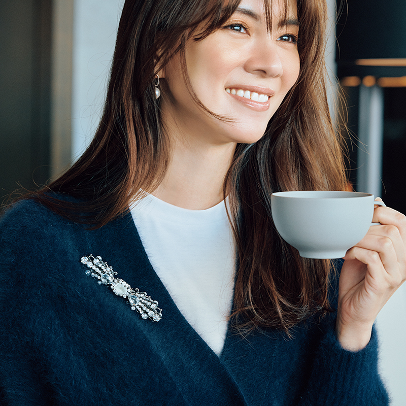 ブローチ¥19,800(RADA/ヴェルメイユ パー イエナ 青山店)カーディガン¥31,900(マルティニーク/マルティニーク ルミネ横浜)カットソー¥2,390(神戸レタス)ピアス¥10,450(ココシュニック オンキッチュ/ココシュニック)