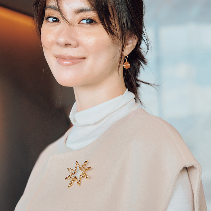 ブローチ¥16,500(アデル ビジュー)ジレ¥39,600(カデュネ/カデュネ プレスルーム)シアートップス¥13,200(マイカ アンド ディール/マイカ アンド ディール 恵比寿店)ピアス¥121,000(マリハ)
