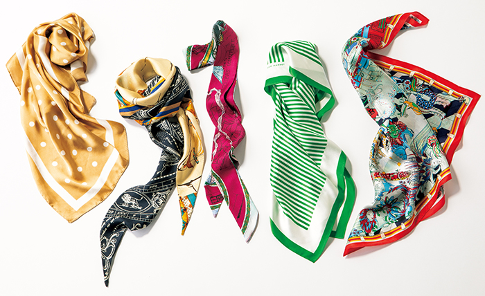 王道の馴染みベージュのドット柄。合わせる服を選ばないオールマイティなデザインです。[70cm×70cm]¥1,100(神戸レタス)、シンプルに結んでもバランスがとりやすい、細長いダイヤ型。[全長145cm、幅30cm]¥14,300(マニプリ)、剣先型なのでネクタイのようにも使えます。[全長130cm、幅5cm]¥9,900(マニプリ)、肌の赤みを和らげてくれるグリーンのストライプ。[65cm×65cm]¥12,100(マナー・マーケット/ショールーム ロイト)、赤の縁取りが結んだ時のアクセントに。[53cm×53cm]¥11,000(アルアバイル)
