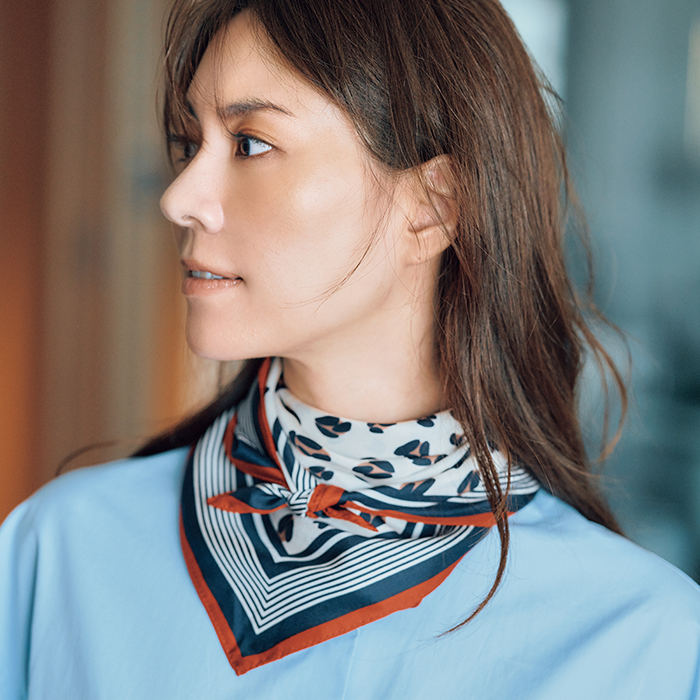 スカーフ[65cm×65cm]¥9,900(ドレステリア/ドレステリア 渋谷スクランブルスクエア店)シャツ¥20,900(ヴェルメイユ パー イエナ/ヴェルメイユ パー イエナ 青山店)