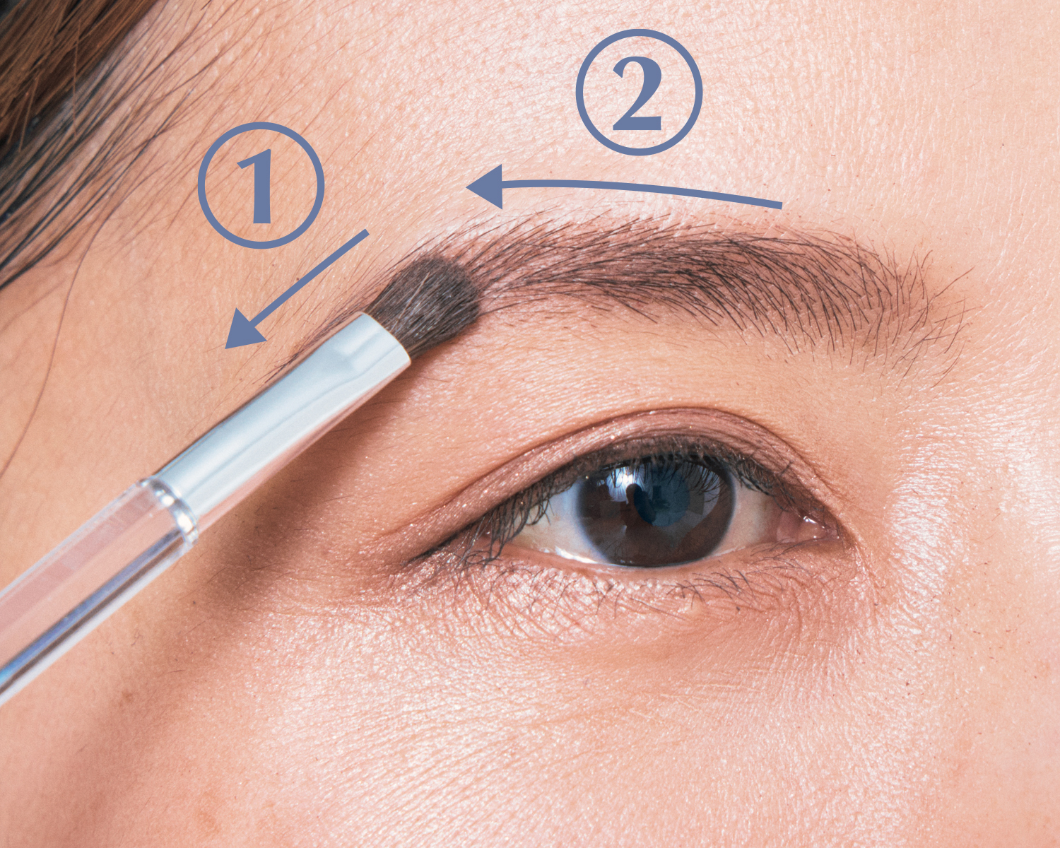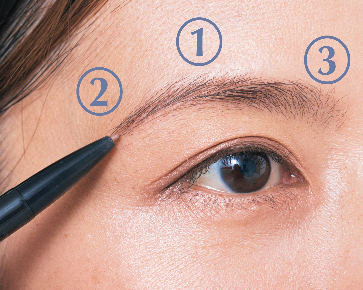 自然なアーチ形にするため、毛の隙間を埋めるように眉ペンシルで①②③の順に描き足します。眉尻は毛を寝かせるように、眉頭は立てるように描き、長さは自眉の幅でOK。