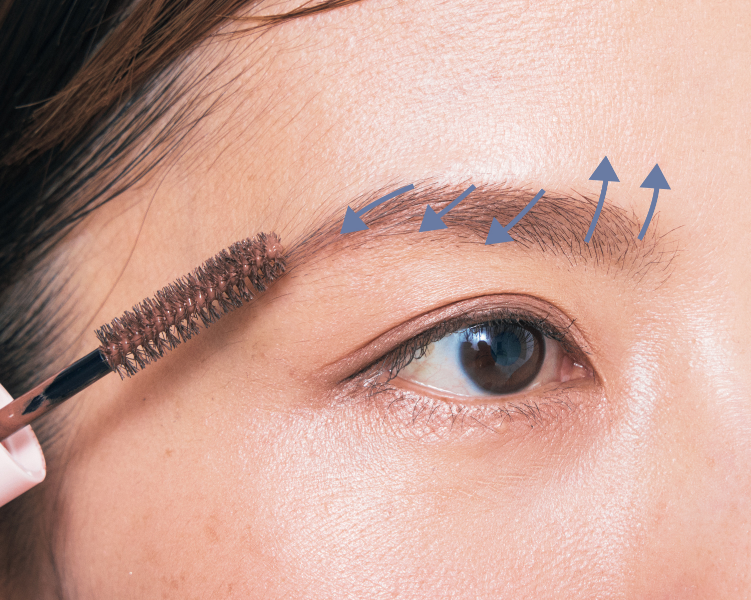 4の後にブラシに残った液で眉頭から眉尻まで矢印の方向に毛流れを整えます。スフレっぽい質感のピンクブラウンを使うことで、毛質も毛の色もまろみのある柔らかい印象に。