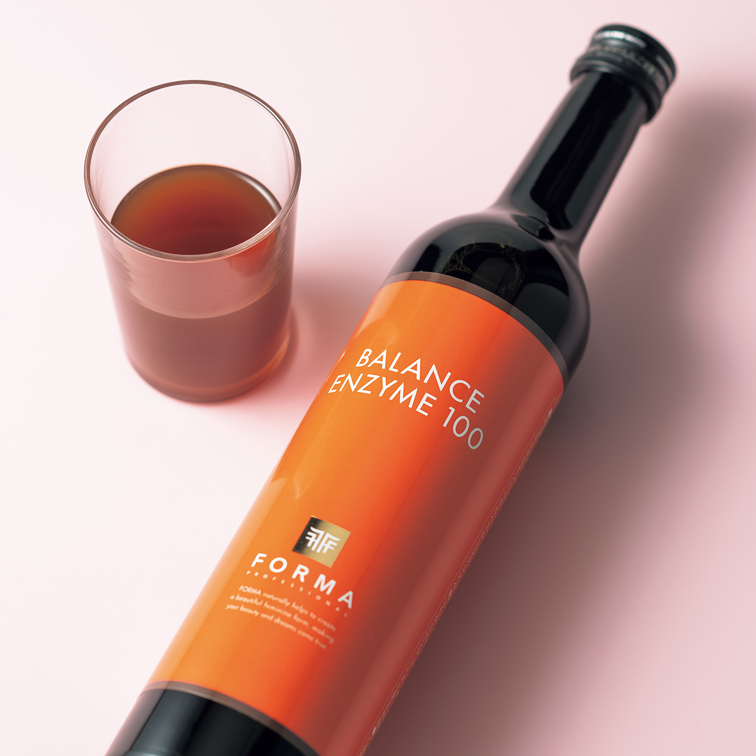 「栄養バランスが偏りがちな多忙な方にはこれ!朝食代わりや会食前に飲んでいただくと、『快腸になった』と嬉しい声をいただいています」フォルマ バランスエンザイム100 500ml ¥10,584(プレミア・ビューティ・アンド・スパ)
