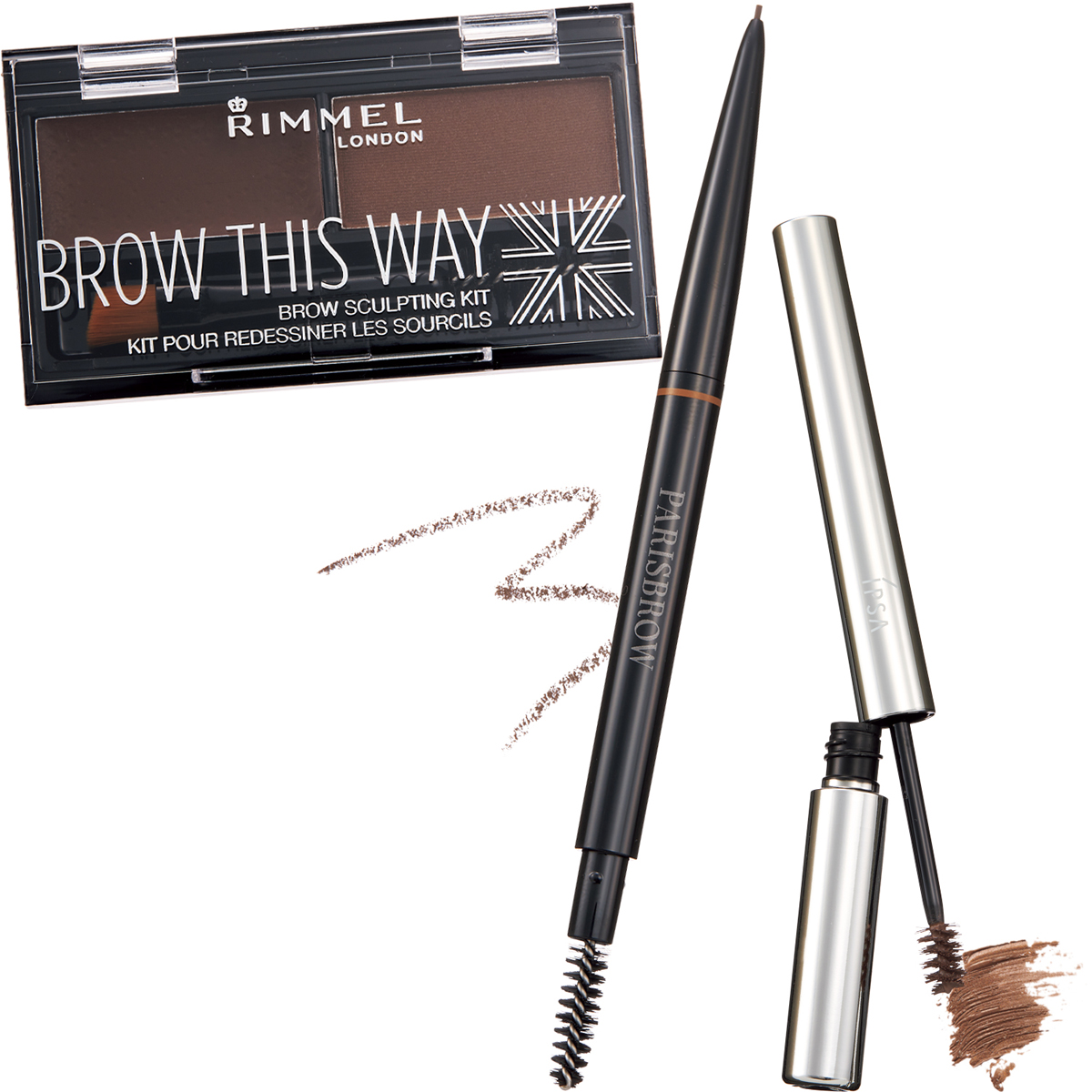 左上:ワックス+パウダーで3D眉に。ブロウ ディス ウェイ アイブロウ スカルプティング キット002 ¥1,320(リンメル)中:地眉のような繊細な仕上がり。スリムブロウペンシル01 ¥1,980(パリブロウ)右:地眉の薄さをカバーしながら立体感も表現。眉の色・毛流れを細部まで均一に整えます。アイブロウ マスカラ03BR(レフィル)¥2,420(イプサ)