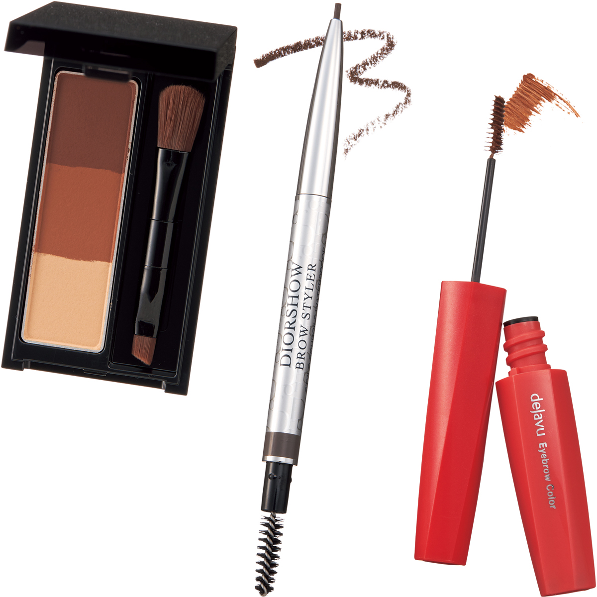 左:ケイト デザイニングアイブロウ3D EX-6 ¥1,210〈編集部調べ〉※店頭・Webにて発売、店頭のみ数量限定(カネボウ化粧品)中:ディオールショウ ブロウ スタイラー ウォータープルーフ032¥4,950(パルファン・クリスチャン・ディオール)右:デジャヴュ アイブロウカラー ウォームブラウン ¥880(イミュ)