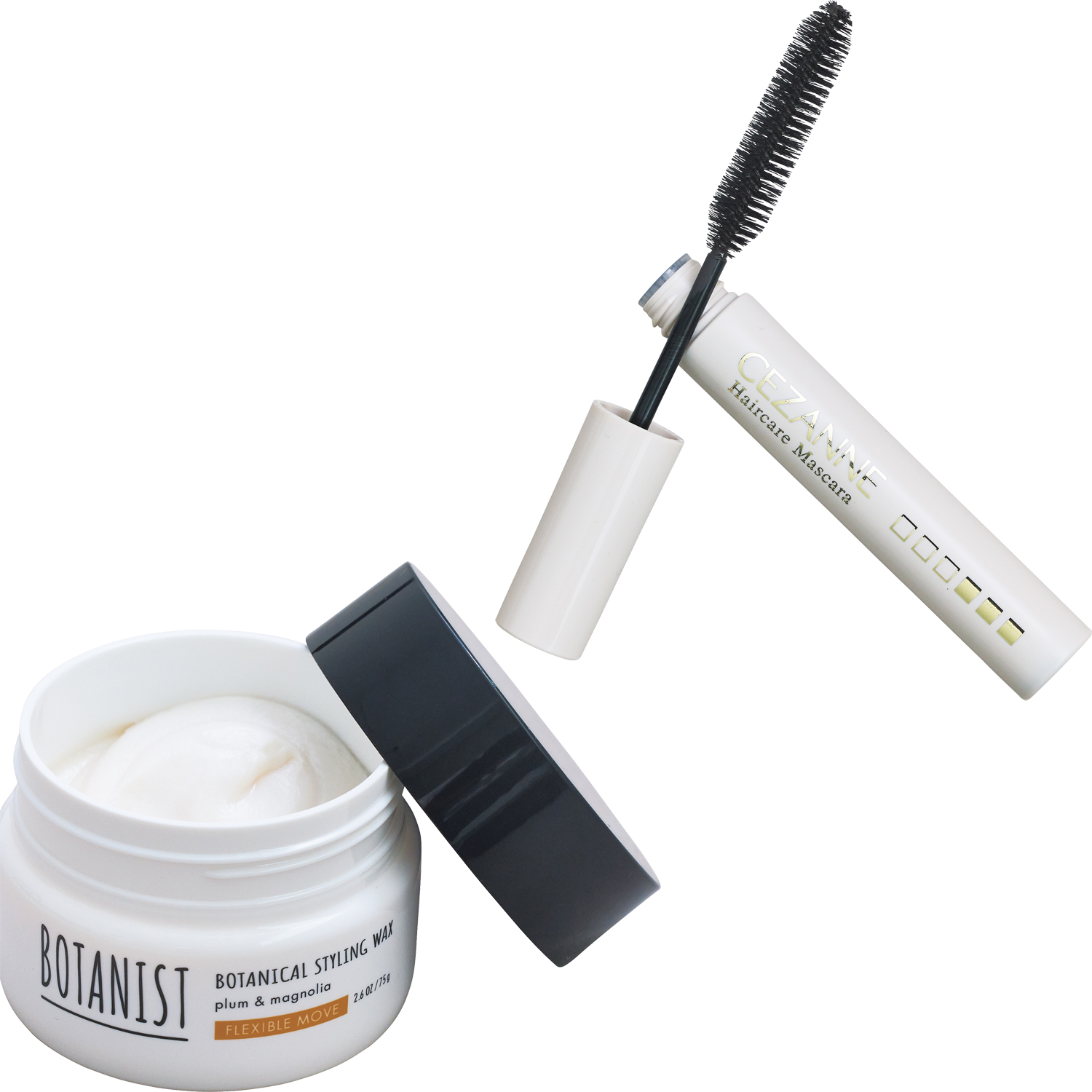 左:ほどよいキープ力と束感で立体的に仕上がります。ボタニカルスタイリングワックスフレキシブルムーブ 75g¥1,518(I-ne)右:アホ毛も白髪もサッと一塗りでカバーできるマスカラタイプのセット剤。ヘアケアマスカラ 10 ダークブラウン¥715(セザンヌ化粧品)