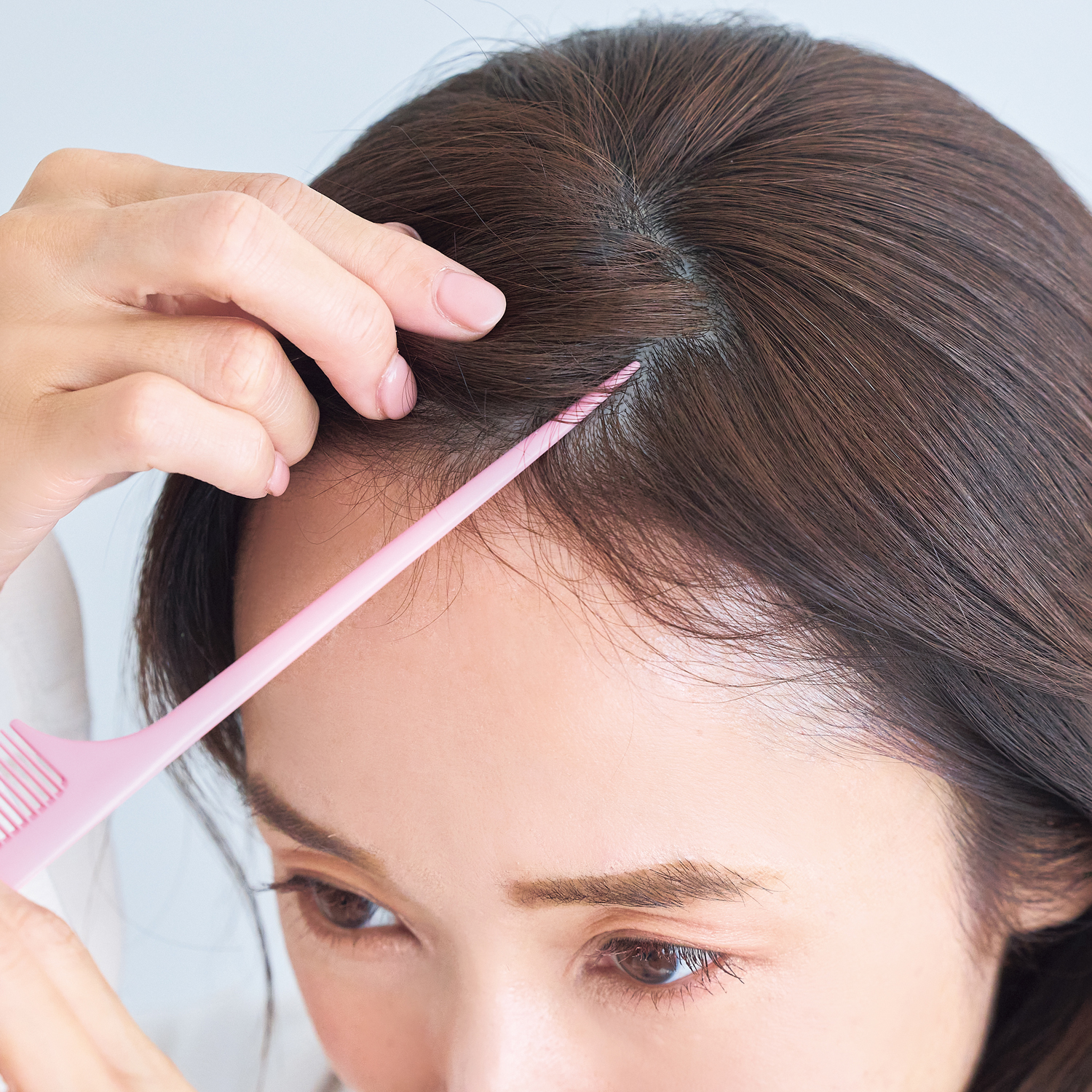 ④ 分け目を変えるとアホ毛が目立つだけでなく白髪が見える場合があるので、マスカラでカバー。