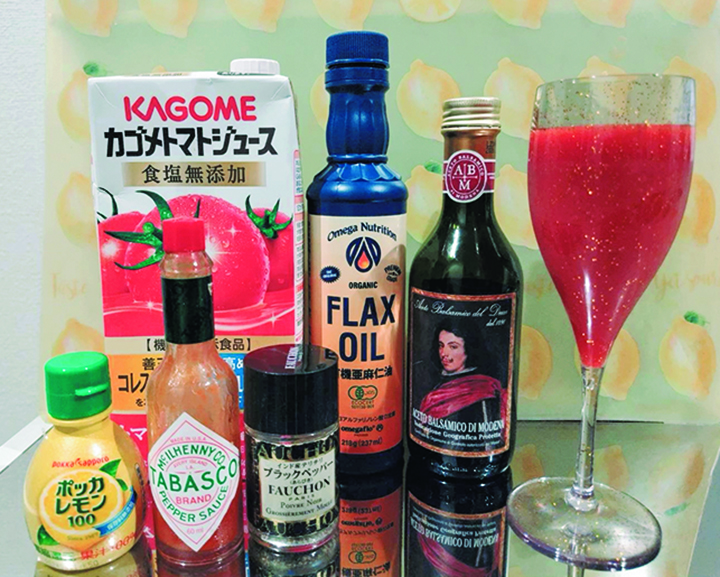 毎日日中にタバスコ、胡椒、レモン、バルサミコ酢、亜麻仁オイルをトマトジュースに混ぜて飲んでいます。脂肪燃焼効果のある食材を一緒に取り入れ、全身シュッと引き締め。