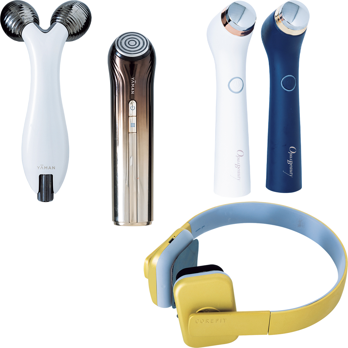 毎日朝晩美顔器は必ず使います。左からEMSとローラーケアのW効果のヤーマンのウェイビー。RFとEMSでリフトケアが叶うブルーム ダブルアール。目元ケア用のオーパスビューティー04は2個持ち。頰の深部筋肉にアプローチするコアフィットのフェイスプレイヤーは家事をしながらながらで使用しています。他にドライヤーはEMSベルトを巻きながら。