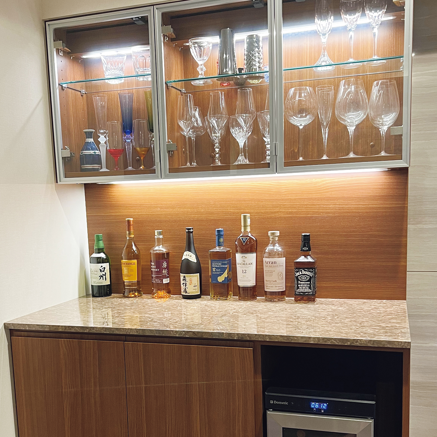 「お酒が大好きなので、コロナ禍の中で家をリフォームした際、友だちが遊びに来たときにお酒を作って楽しめる場所があるといいな、とリビングにバーを作りました。照明もつけて、棚には集めてきたグラスやお酒を収納。お休みの日はここで大好きなお酒を飲んでリフレッシュ」