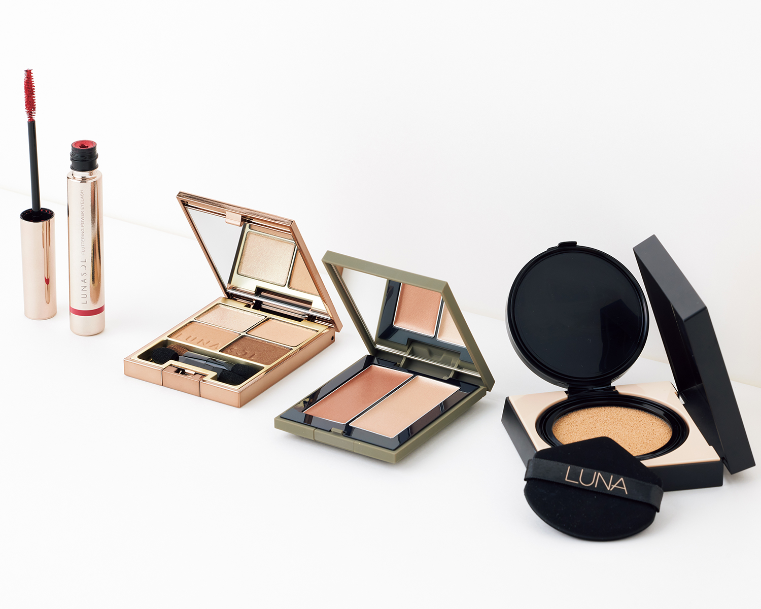 左から:「ピンクのマスカラで柔らかさをプラス」ルナソル シャイニングラッシュマスカラ EX01 ¥3,850(カネボウ化粧品)、「さりげない陰影が出せる鉄板ベージュ」ルナソル スキンモデリングアイズ 01¥5,500(カネボウ化粧品)、「ツヤとメリハリを足すときに」THREE シマリング グロー デュオ 01 ¥4,950(THREE)、「ほどよいツヤ感が出るクッションファンデ」LUNA ロングラスティング コンシールウェアクッション(スタッフ私物)