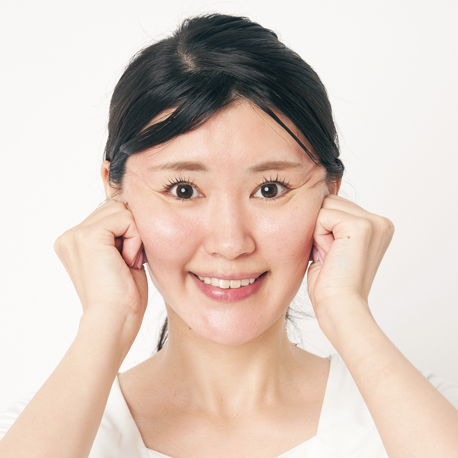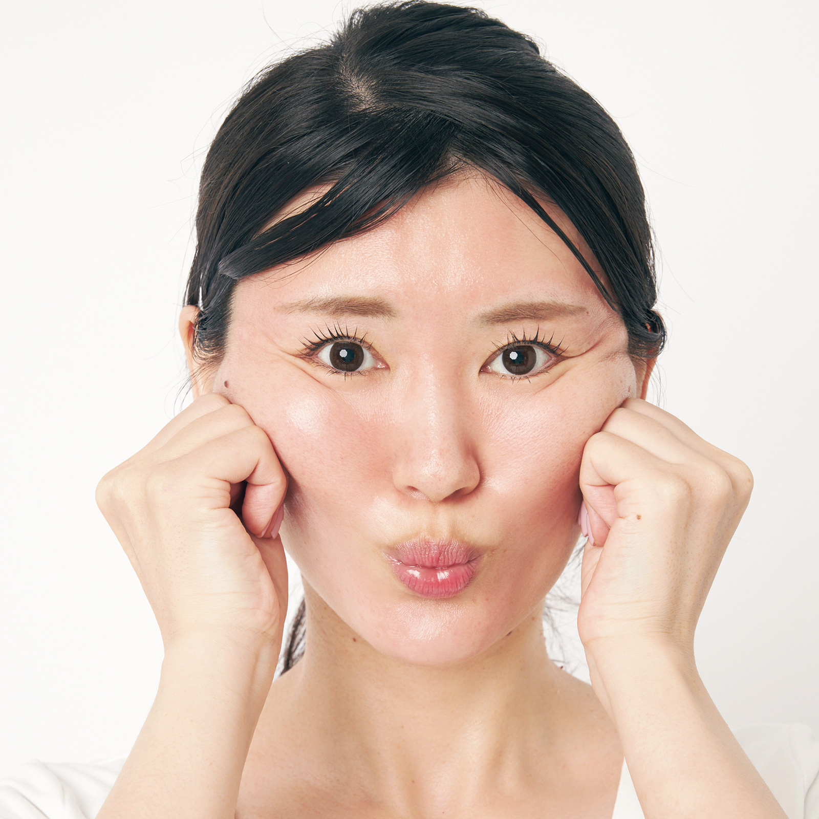 ①パール粒1個分を顔に広げます。ウに口をすぼめ、顎先~耳の下、口角~耳の横まで3カ所ずつ肌を押してから上に持ち上げ3秒キープします。