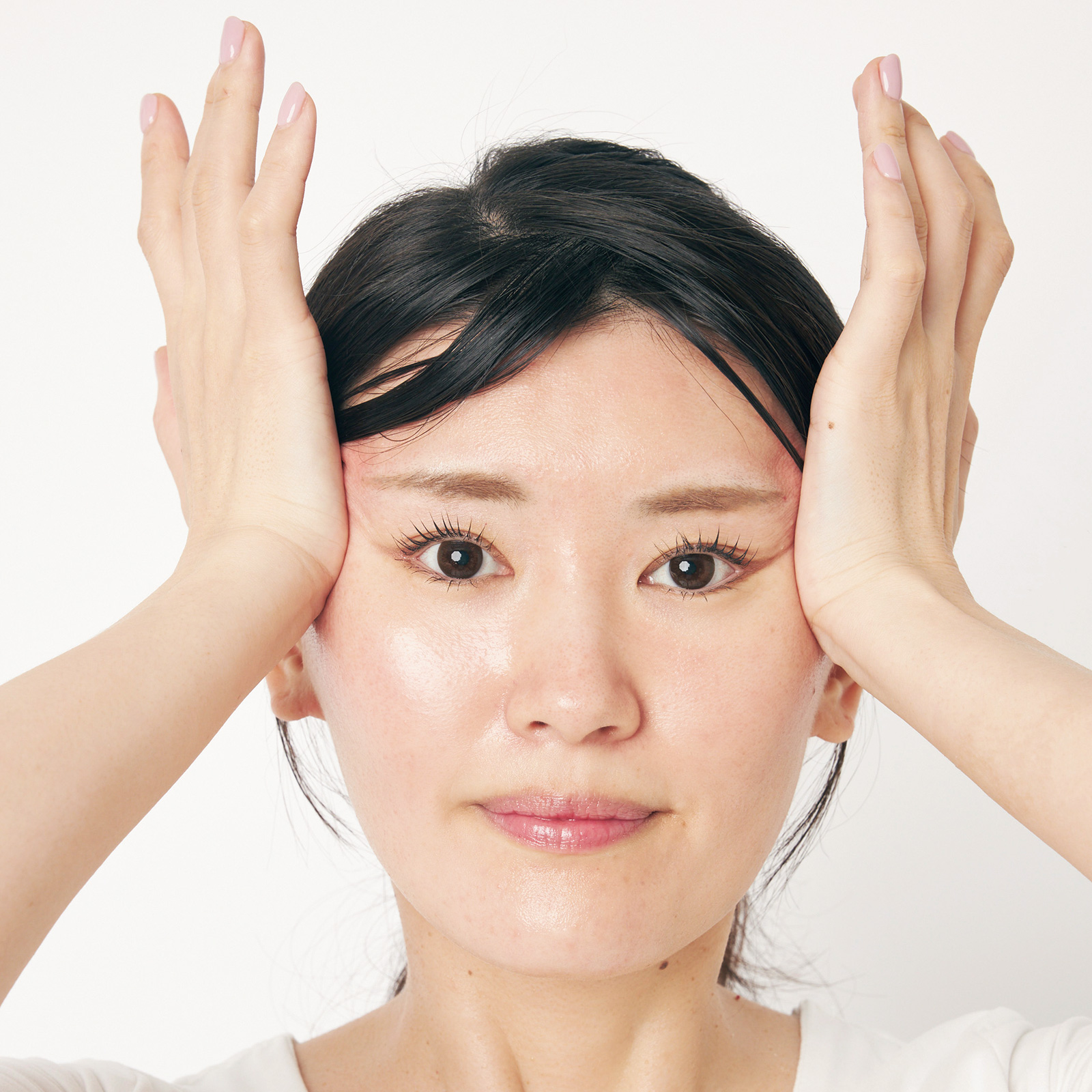 ③手のひら全体で、フェイスラインから目の下を通り、こめかみに向かい肌を引き上げ、こめかみで10秒キープします。