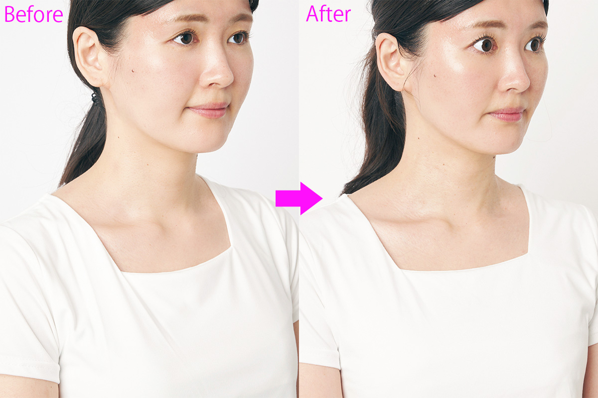 頰~下半顔のゆるみ&もたつきが解消されシャープなフェイスラインが現れて、頰の位置が高くなりました。首も長く見えスッキリとした印象に。