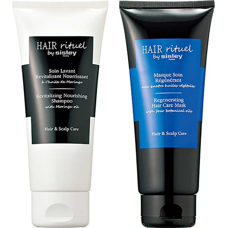 毛髪に加え頭皮ダメージの修復を促します。左から:ヘアリチュアルエンリッチドモイスチャライジングシャンプー 200ml ¥10,450、同ヘアケアマスク 200ml ¥12,980 (シスレー)