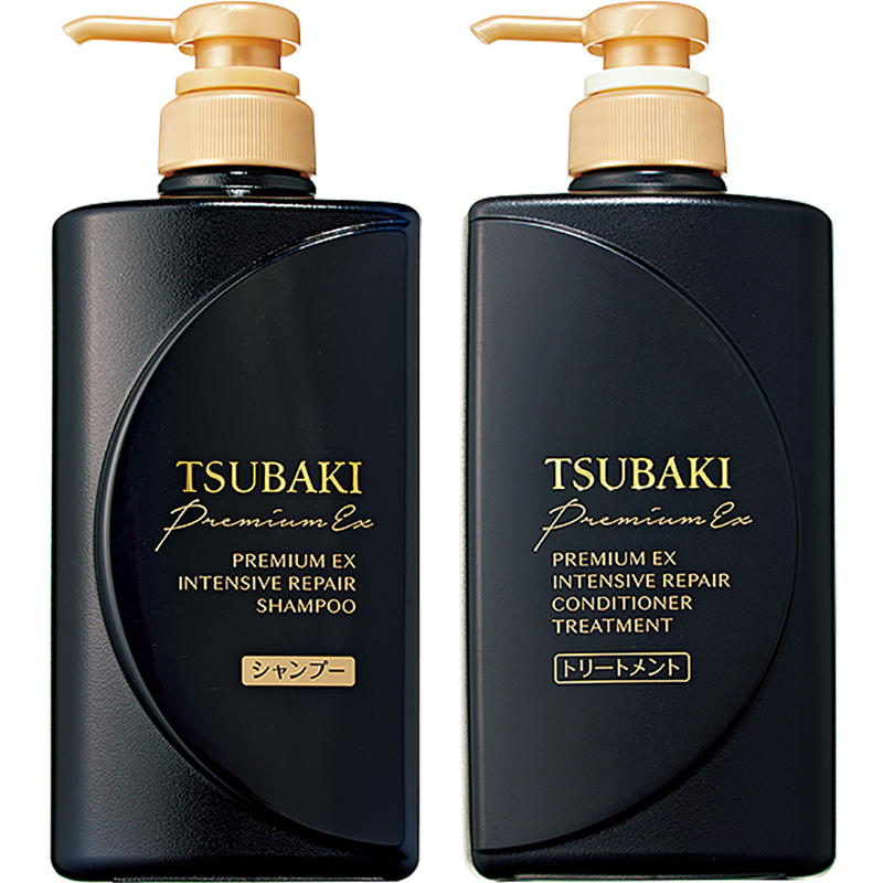 シリーズの最高峰。柔らかくなめらかなうっとりする指通りに。左から:プレミアム EX インテンシブリペアシャンプー、同コンディショナー各490ml 各¥1,078〈編集部調べ〉(ファイントゥデイ)