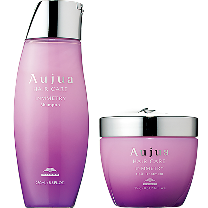 髪に強く吸着するケラチンを配合。ゆがみをフラットに整えます。左から:オージュアインメトリィシャンプー 250ml ¥5,500、同ヘアトリートメント 250g ¥6,600 ※美容室専売品(ミルボン)