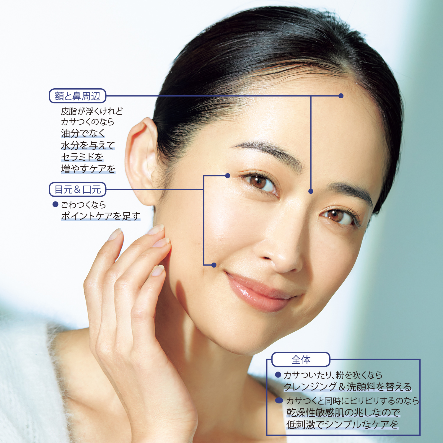 肌を立て直したい時季には肌状態を見極めて、シンプルで正しい重点ケアを。つけすぎは禁物です。肌乾燥にはこっくりクリーム、とはすぐに考えず、まずは水分と油分のベストバランスを考えます。刺激を与えないお手入れの仕方も大事です。