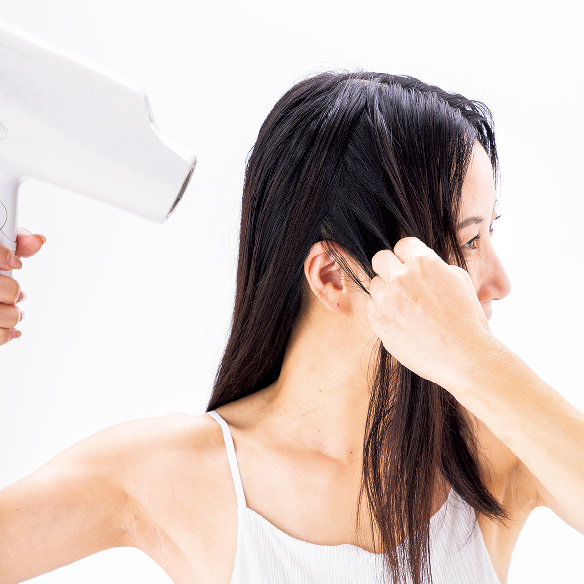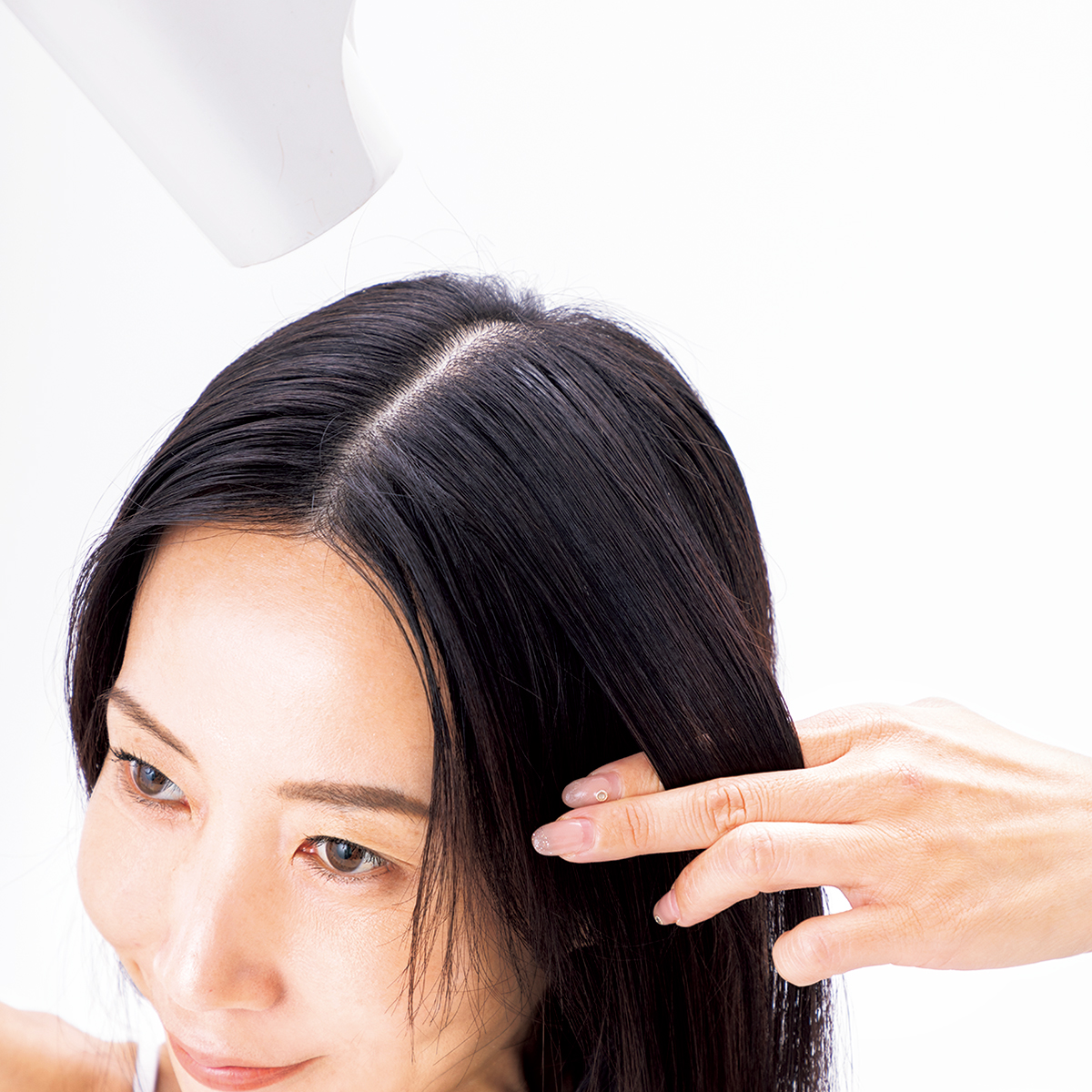 ハチ上の髪は反対側に髪を引っ張りながら乾かします。つむじを包み込むように斜め上方向にテンションをかけてドライすることで、どこから見てもトップの地肌が透け見えしない仕上がりに。