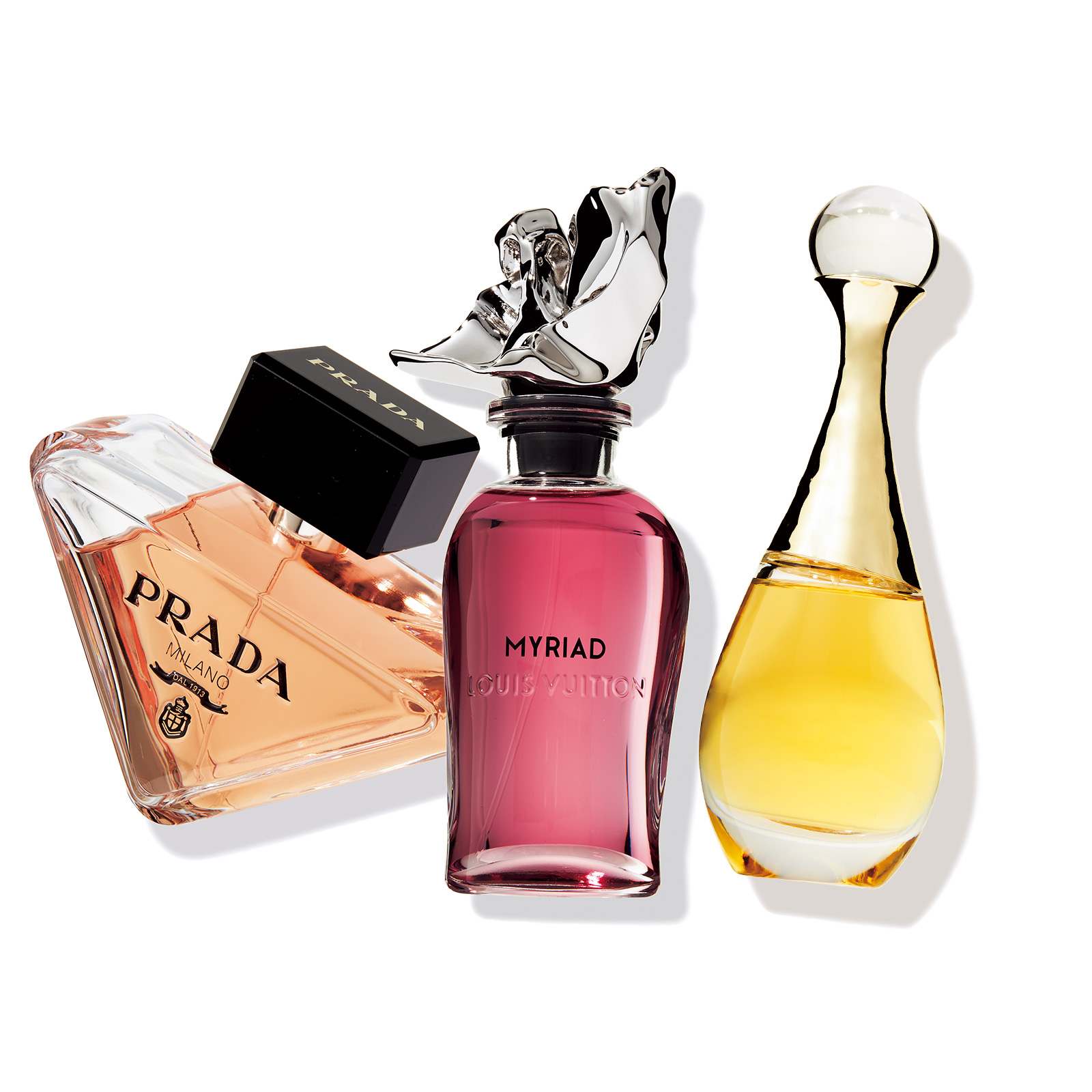 左・プラダパラドックスオーデパルファム 90ml ¥22,550(プラダビューティ)中・エクストレ・ドゥ・パルファンミリアド100ml ¥97,900(ルイ・ヴィトン)