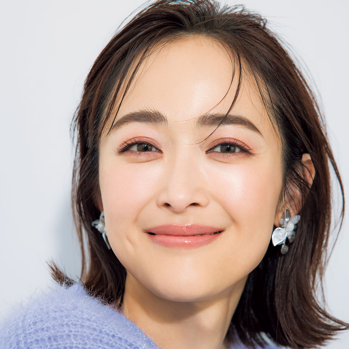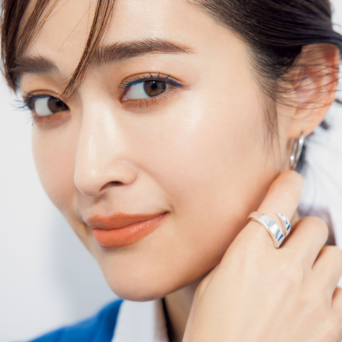 ブルーの目元はかっちり決めすぎると老け見えするので、血色感をプラスするくらいのチークやリップにとどめて抜け感を意識して。アップヘアもあえてラフに仕立てることで、バランスもよくなり、こなれ感が演出できます。