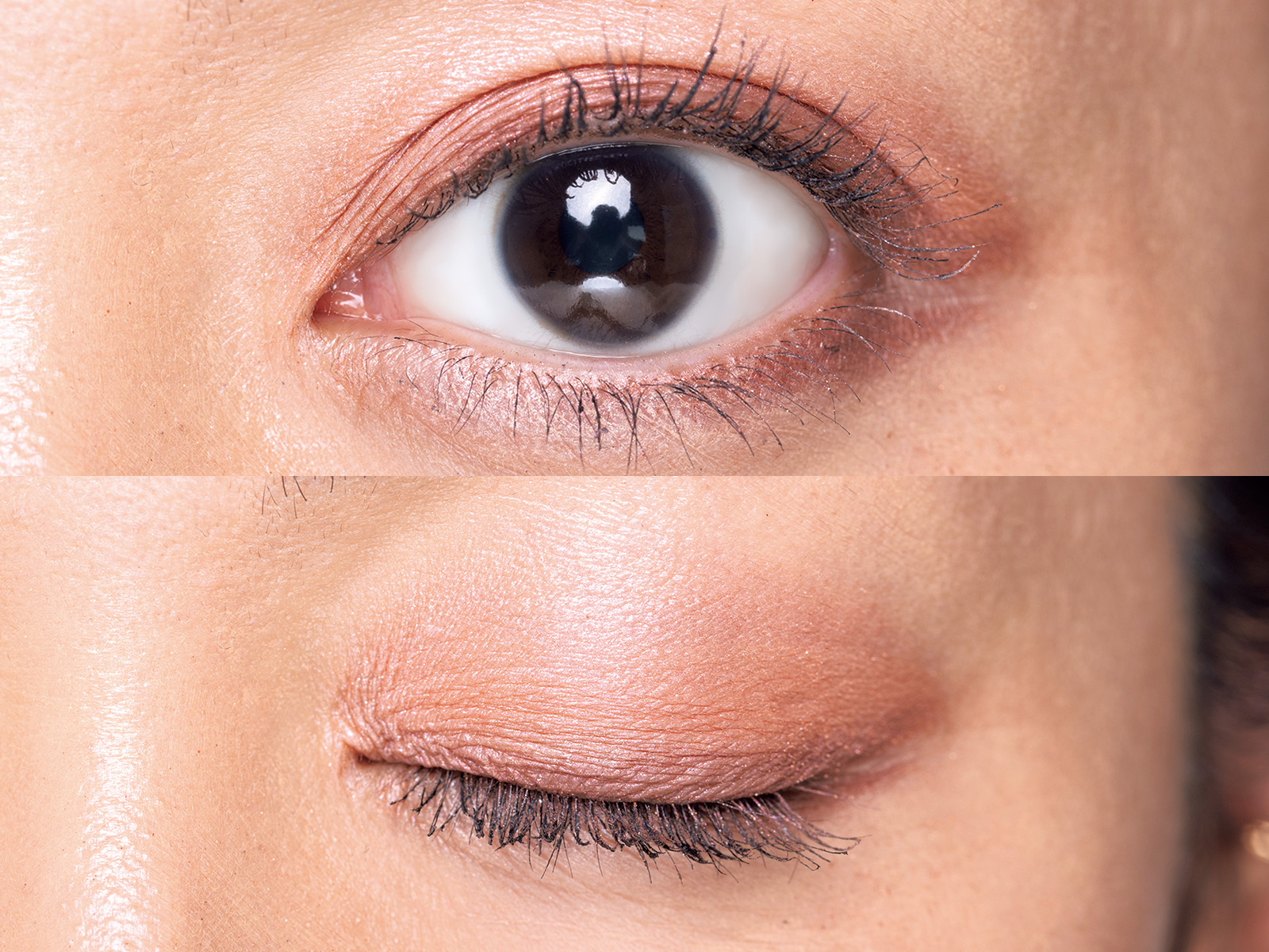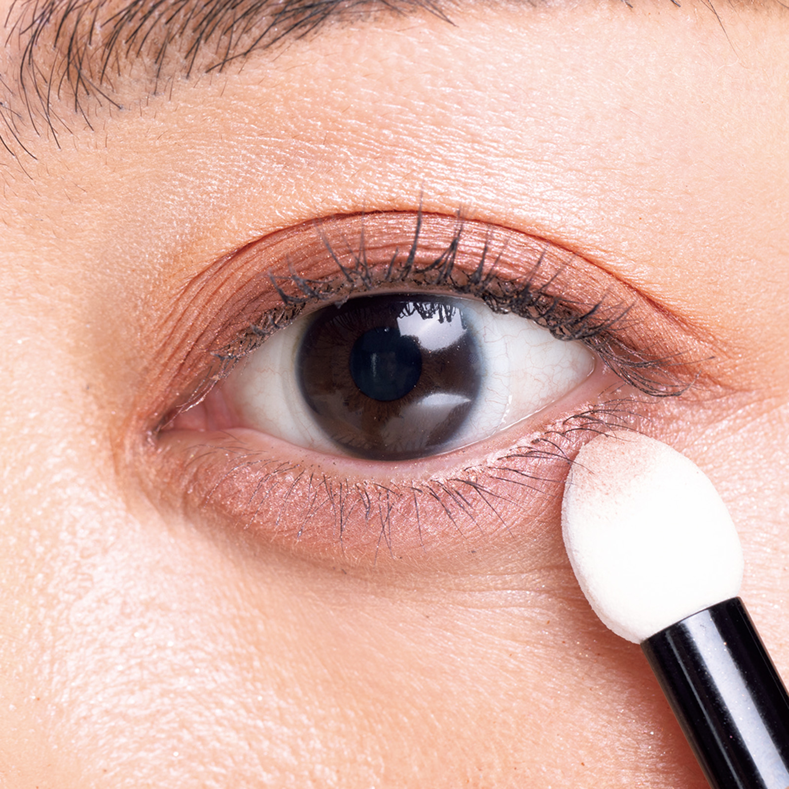 肌馴染みの良い血色カラーの1を目の下全体に。4を黒目の下の部分のみにオン。目の縦幅が広がり、黒目がちな眼差しを叶えます。
