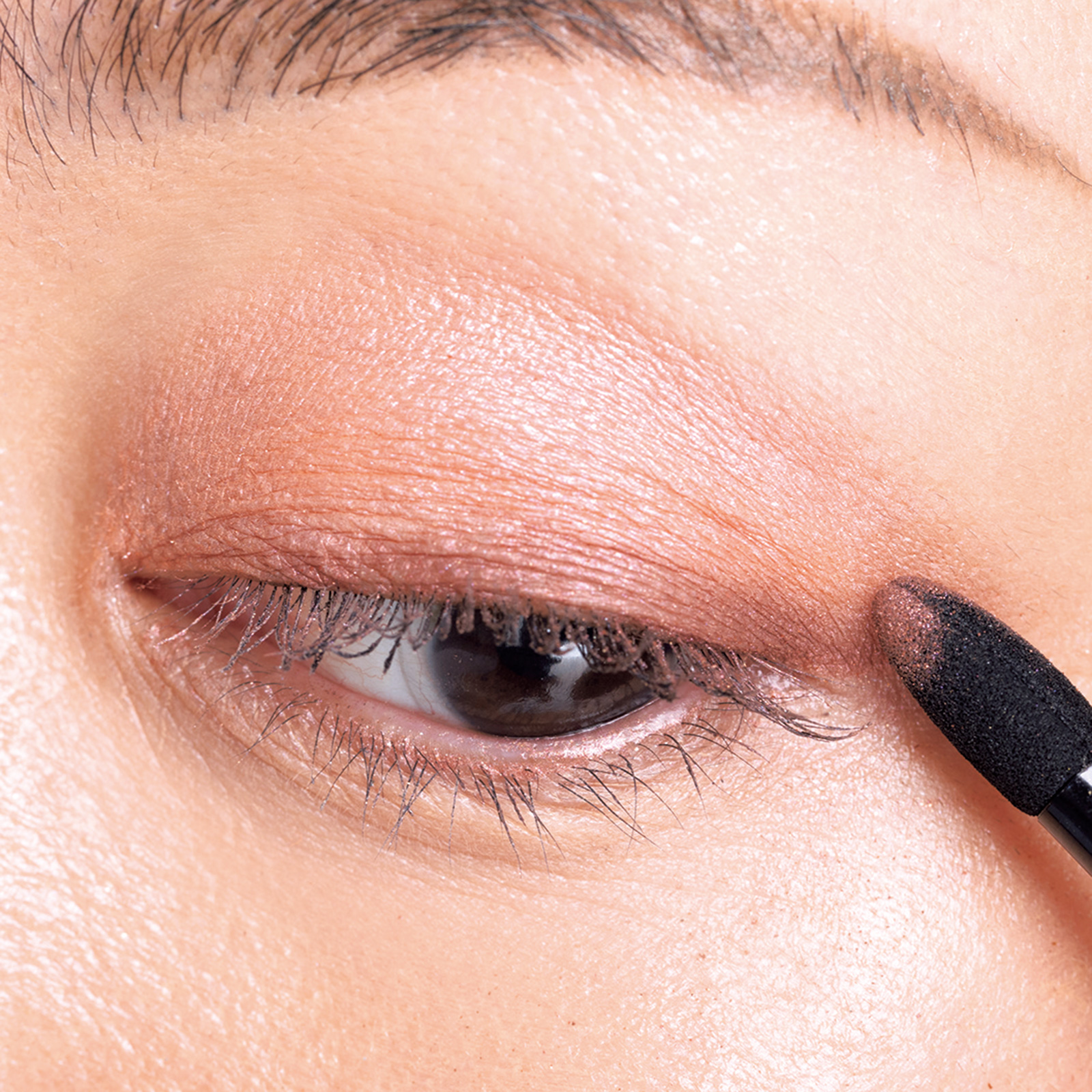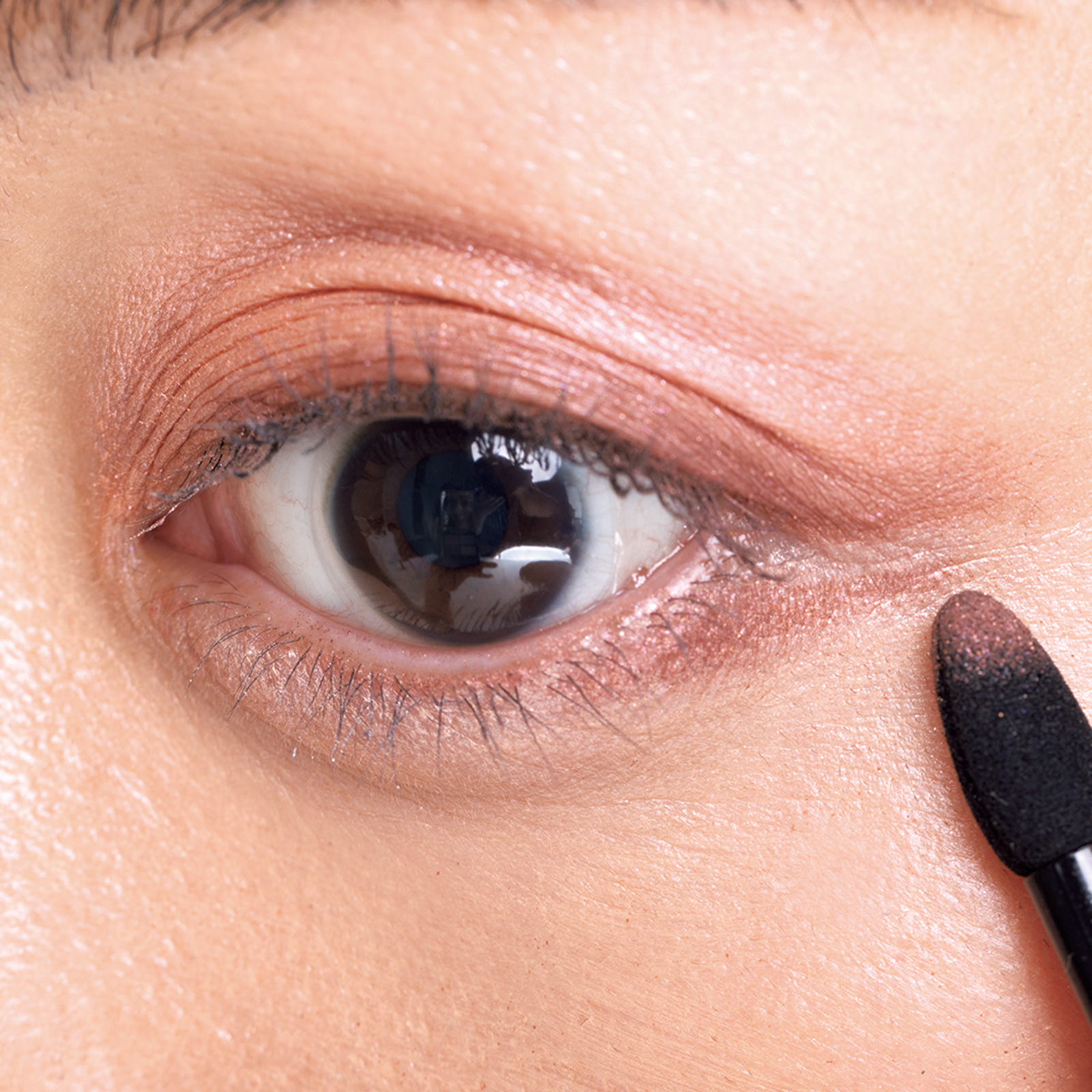 1をアイホールに横長に伸ばし、2を二重幅に足して滲むような血色感を演出。付属の細いチップに4を取り目尻2mmほど跳ね上げて。