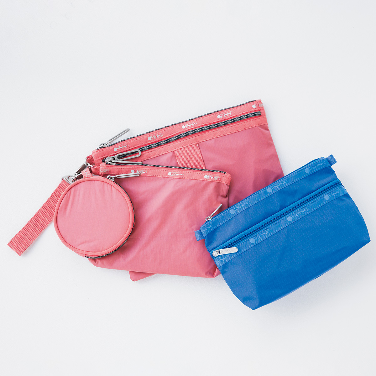 旅行のとき荷物が増えがちな人にイチ推しなのが、ピンク3連ポーチ(大H20×W27、中H16×W20、小H11×W11×D2cm)¥18,700。出張用にはネイビーキルティングポーチがおすすめです。(H9×W16×D5cm)¥5,060(ともにレスポートサック ジャパン)