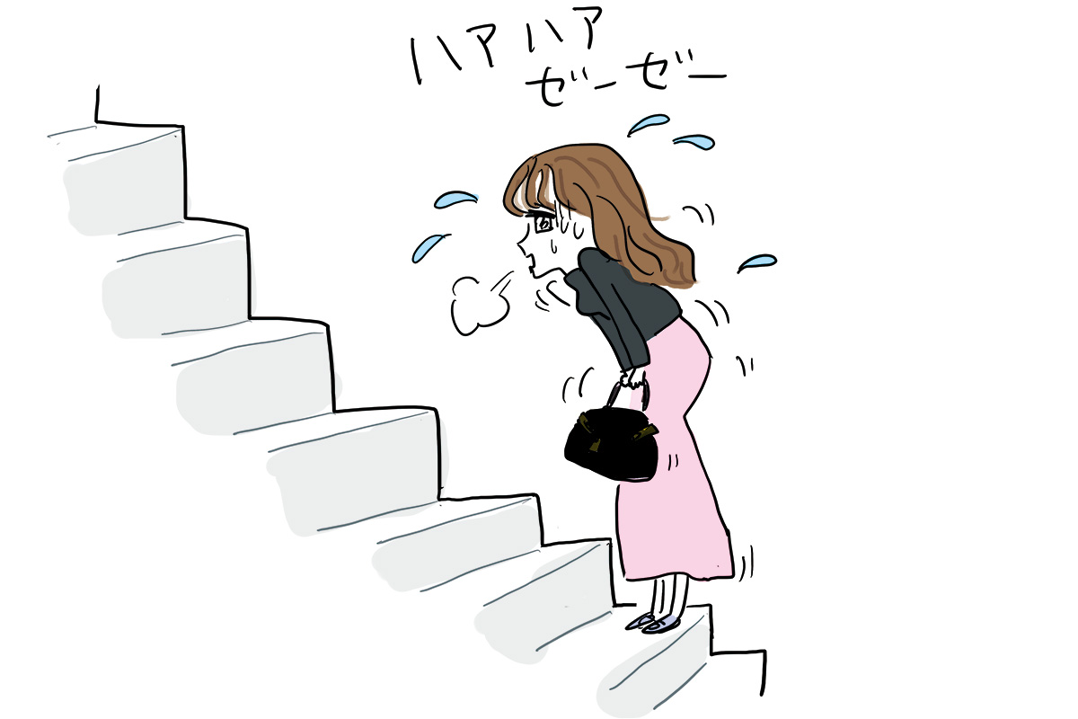 駅の階段や坂道などを上ると途中で心臓がドキドキ。息が切れてゼイゼイ。疲れやすく、近距離でもタクシーに乗る、電車内でもすぐに座る、などは肺が弱っている症状かも。