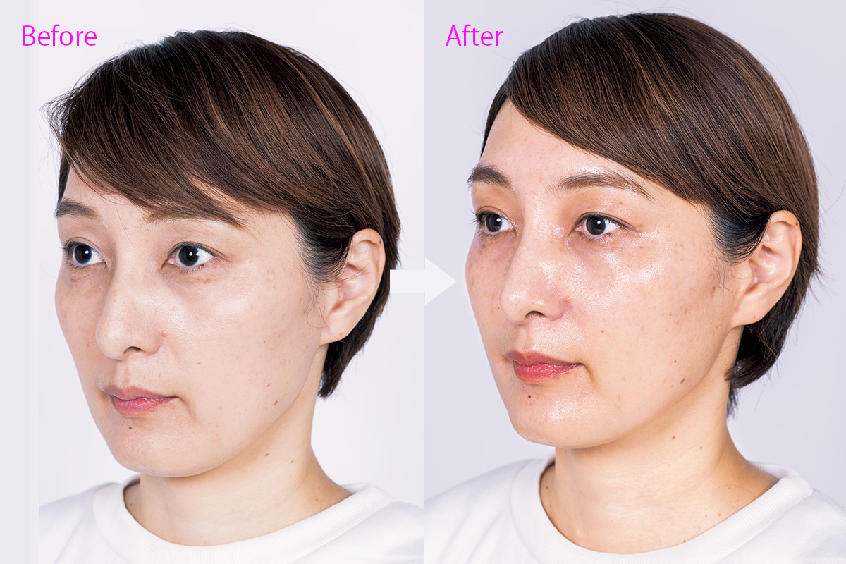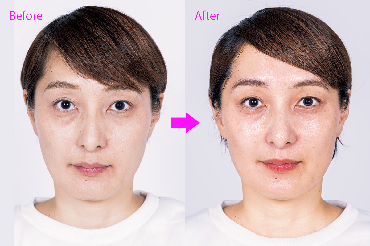 もともと明るい肌がさらに明るく輝くように変化。目元のくすみが払拭されて、肌トーンが均一に。頰やフェイスラインがキュッと上がって、小ジワも改善。生き生きとした印象に。
