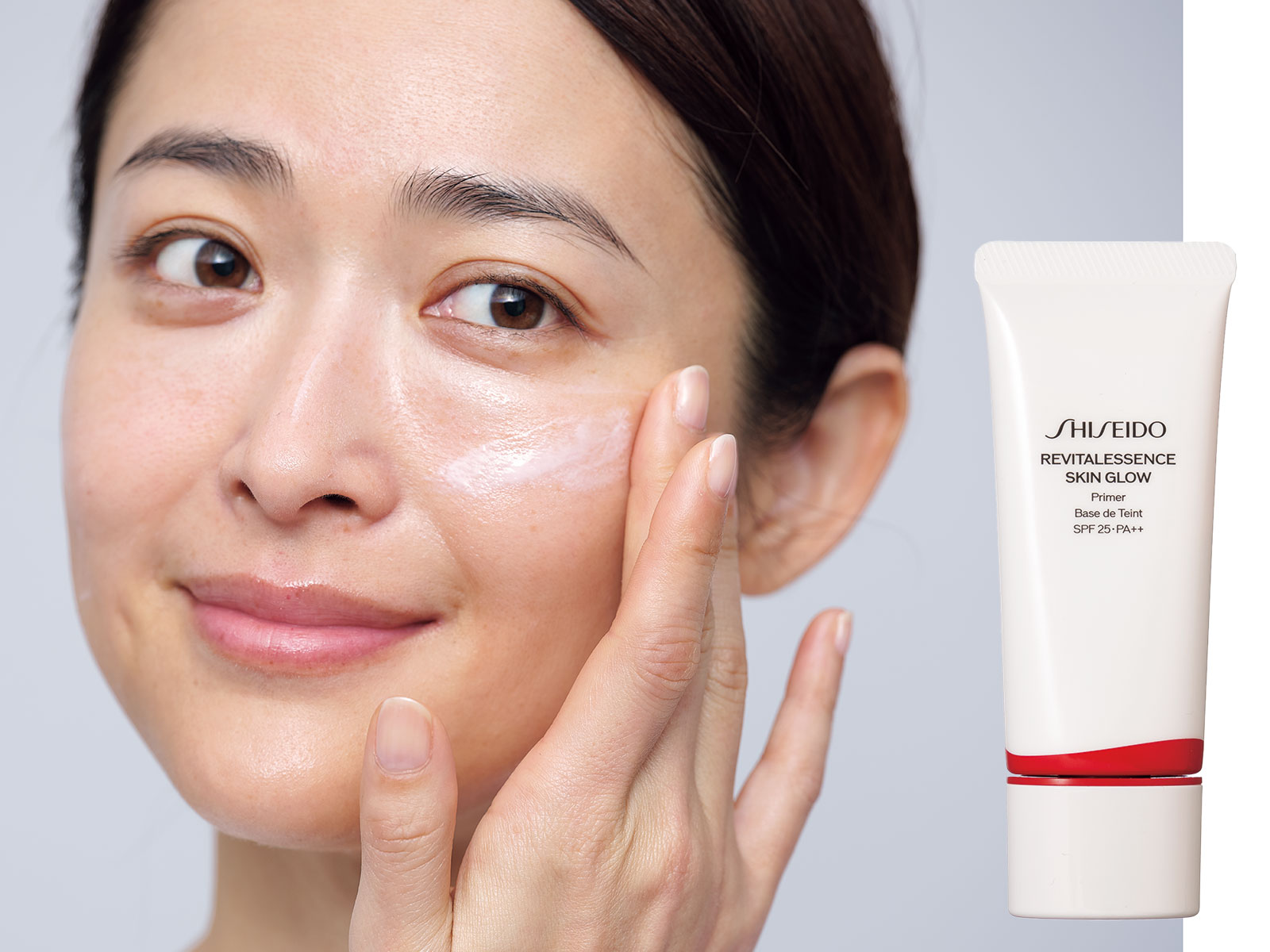 みずみずしいテクスチャーの下地を全顔に均一に伸ばします。肌馴染みが良くアバウトに塗ってもキレイ。凹凸も整います。トーンアップ下地で明るくしすぎるとマットに見える場合も。エッセンス スキングロウ プライマー SPF25・PA++ 30g ¥5,280〈3月1日発売〉(SHISEIDO)
