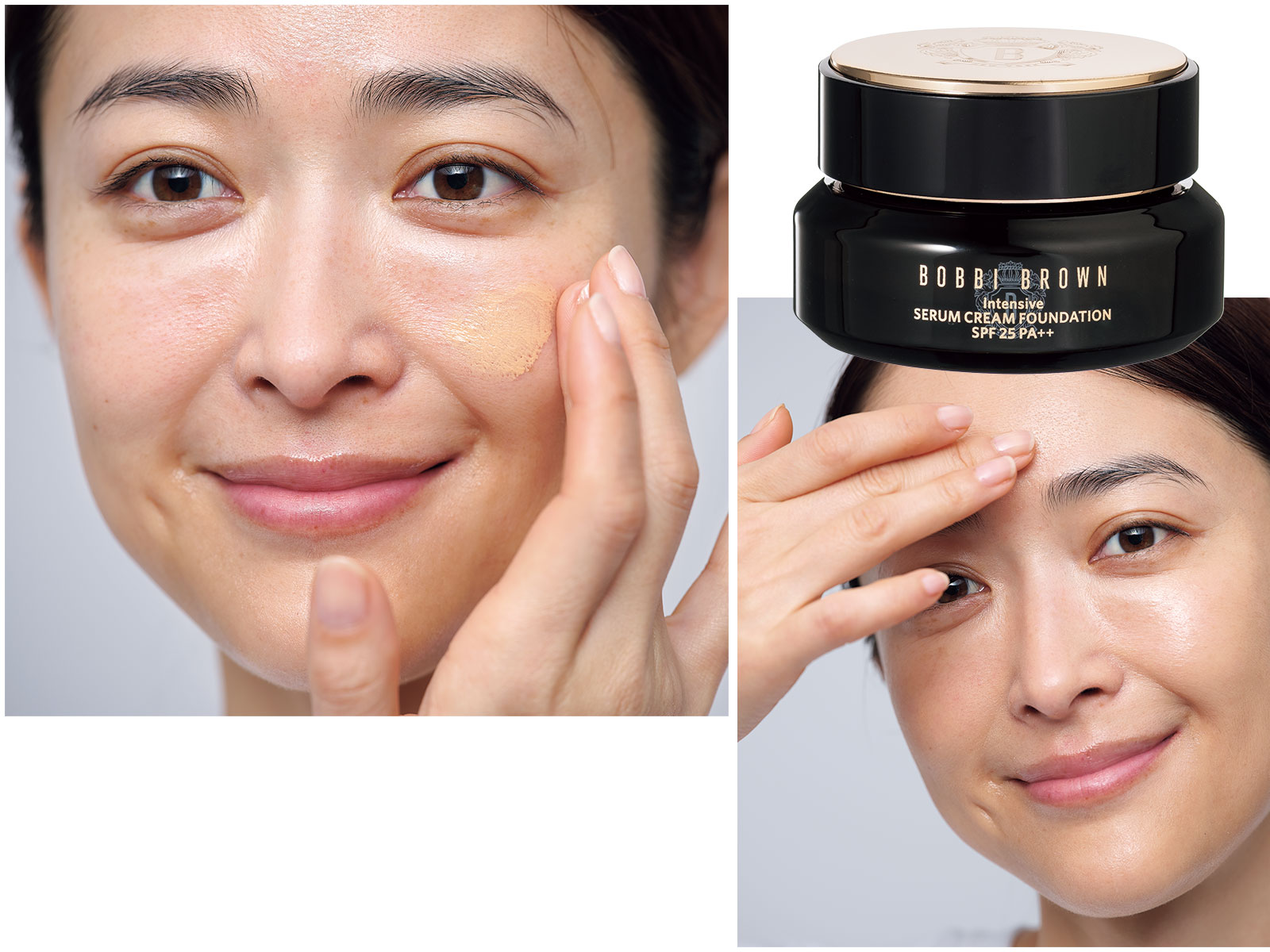 粉体を多く含むハイカバーファンデは粉っぽく見えやすいので、軽やかに馴染む美容液ファンデが◎。トントンやさしく叩いて伸ばし広げます。半顔量は米粒大。完璧にカバーしなくてOK。インテンシブセラムクリームファンデーション全5色 SPF25・PA++30ml ¥10,450(ボビイ ブラウン)