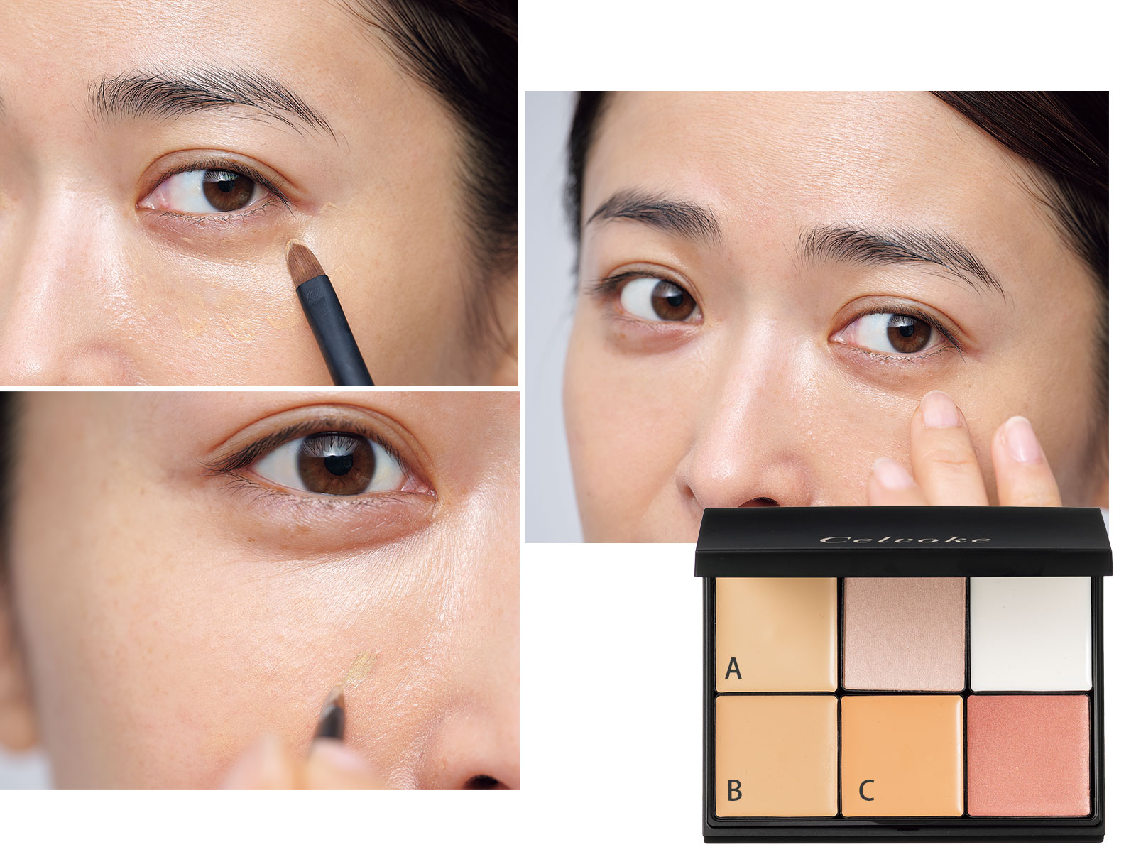 カバーはコンシーラーに任せるのが乾いて見せない秘訣。肌色に合わせてAとBの2色を混ぜたらブラシで目の下に置き、中指でやさしく叩いて薄く馴染ませます。さらにカバーしたい部分はCのオレンジを足し、ブラシを立てて極細線を描いて補整して。シームレス フェイスパレット 01 15g ¥6,490(セルヴォーク)