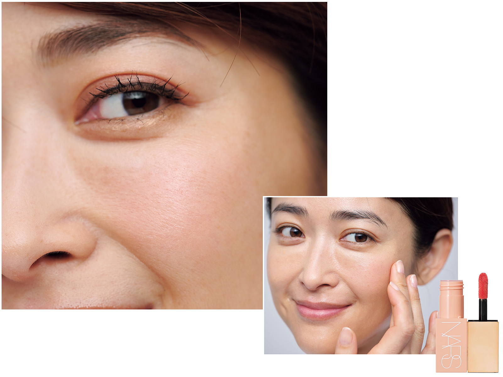 ベースメイクの後、ポイントメイク前にリキッドやクリームなどの練りチークで血色感を軽く仕込んでおけば、さらに乾燥見え防止に効果的。色の効果でうるおって見え、パウダーチークの使用量も減らせます。NARS アフターグロー リキッドブラッシュ 02799 ¥4,620(NARS JAPAN)