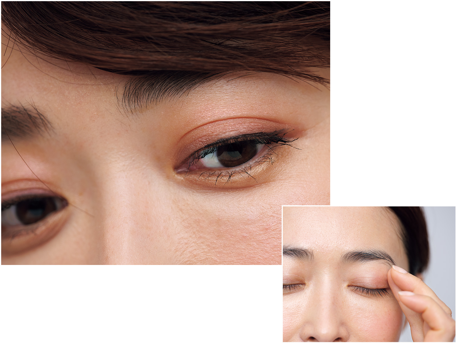 ウェットな単色シャドウをアイホールに薄く馴染ませます。パレットは右上をまぶた全体、右下を二重幅、左上を全体に広めに塗布。下まぶたは右2色を混ぜて塗り、涙袋をぷっくり見せて。